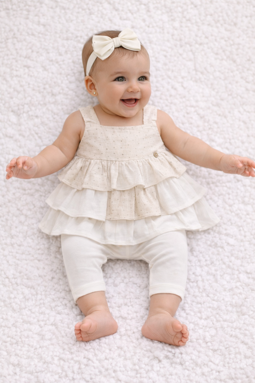 Conjunto de Tres piezas , viene acompañado de un torero sin mangas con un diseño de volantes en capas con delicado bordado, un short tipo leggins de algodón elástico, ideal para brindar libertad de movimiento y un moño para completar el look.