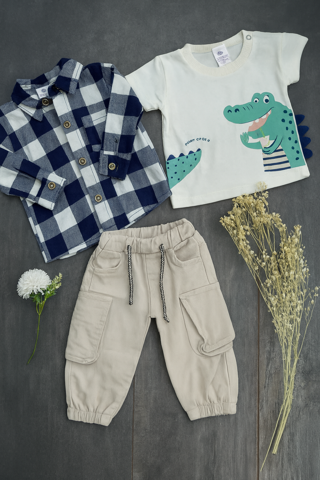 Este adorable set de tres piezas es perfecto para los pequeños llenos de energía y curiosidad. Incluye una camisa de cuadros, una divertida camiseta de algodón con un simpático estampado de cocodrilo, y unos cómodos pantalones tipo cargo, ideales para acompañarlos en cada momento de juego.