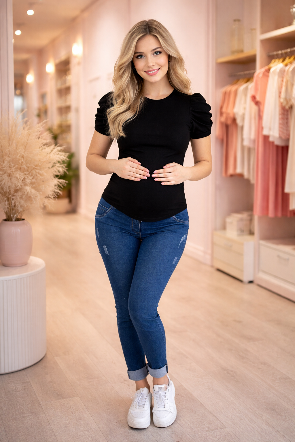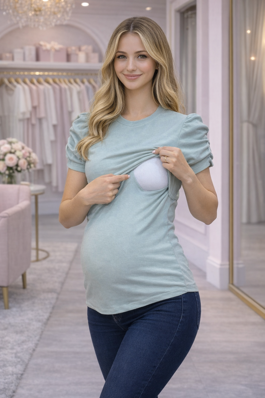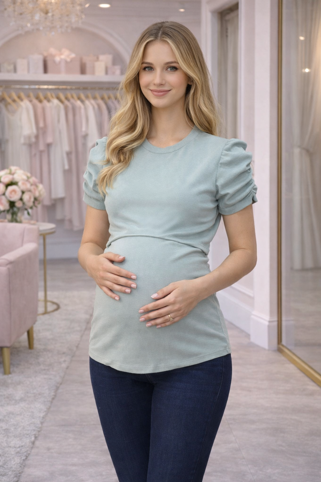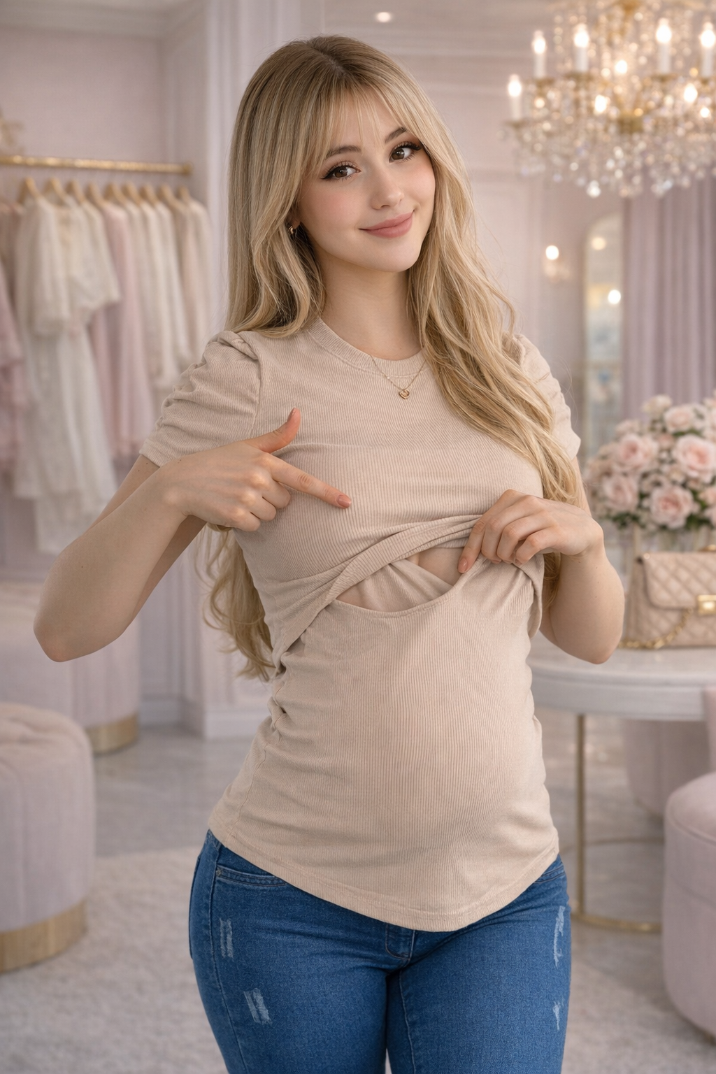 Diseñada para acompañarte durante el embarazo y la etapa de lactancia, esta blusa en tela rib ofrece una textura suave, elástica y cómoda que se ajusta perfectamente a tu cuerpo sin perder la forma. Su Manga con detalle recogido que le da un toque moderno y femenino, Ideal para el día a día, sin renunciar al estilo ni la comodidad.