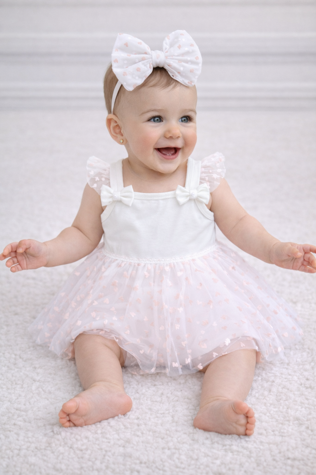 Delicado y encantador: body de tirantes con moñitos y falda de tul con pequeños corazones, acompañado de un lazo a juego. Un look lleno de ternura para momentos especiales.