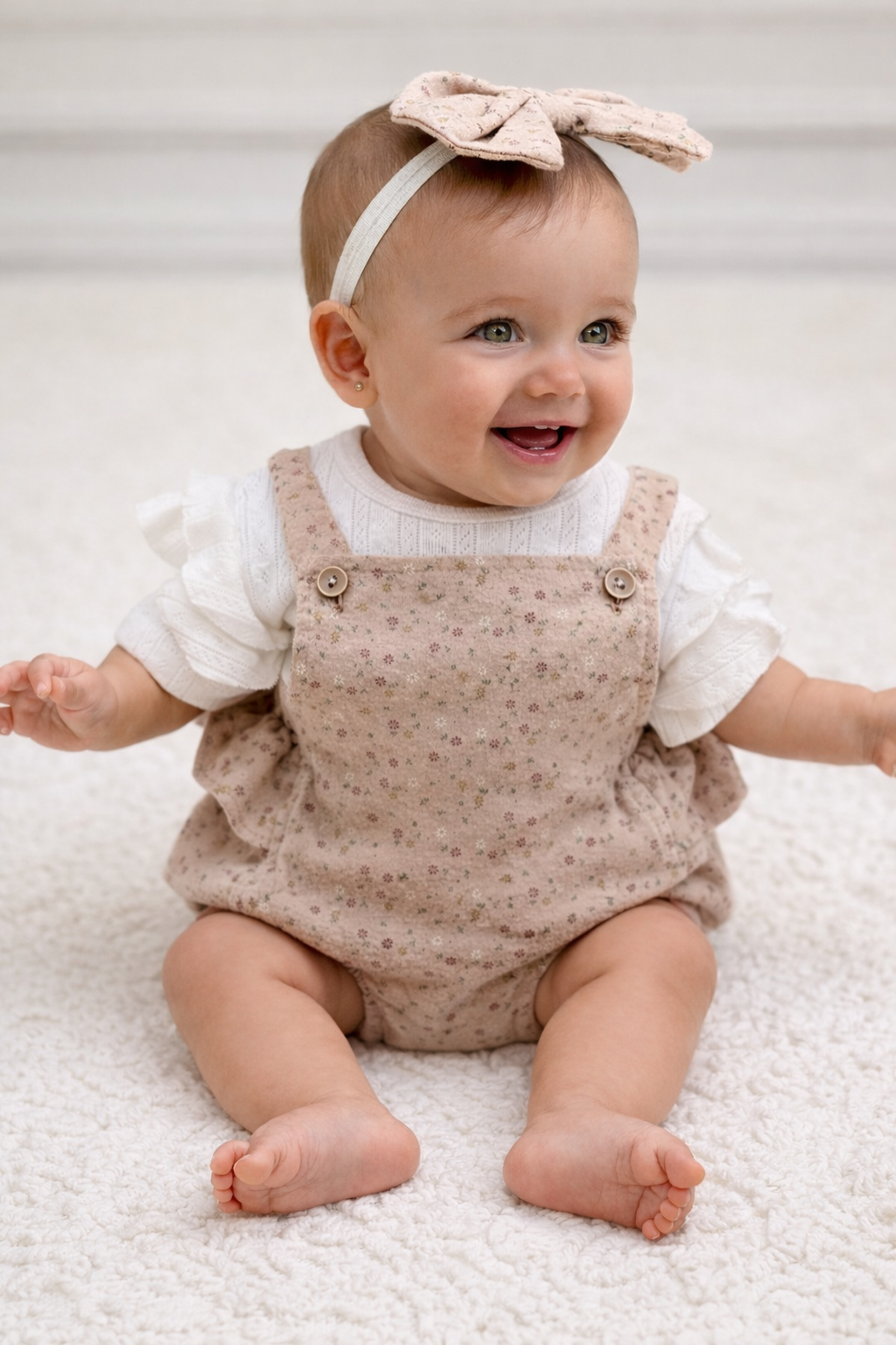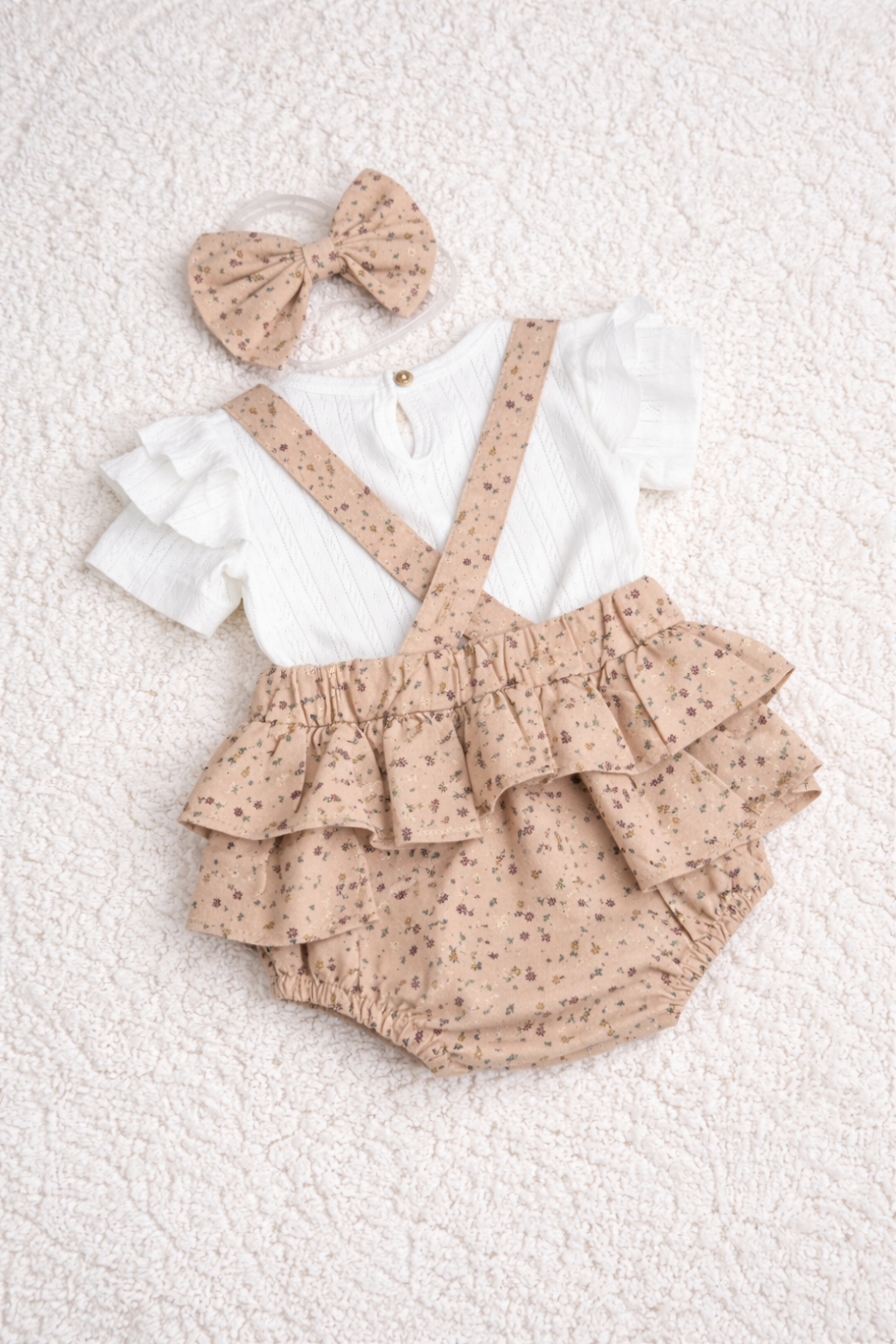Set de tres piezas: Una blusa blanca, un enterizo floreado con volantes y moño a juego. Suave, fresco y lleno de detalles que harán que tu bebé luzca simplemente encantadora