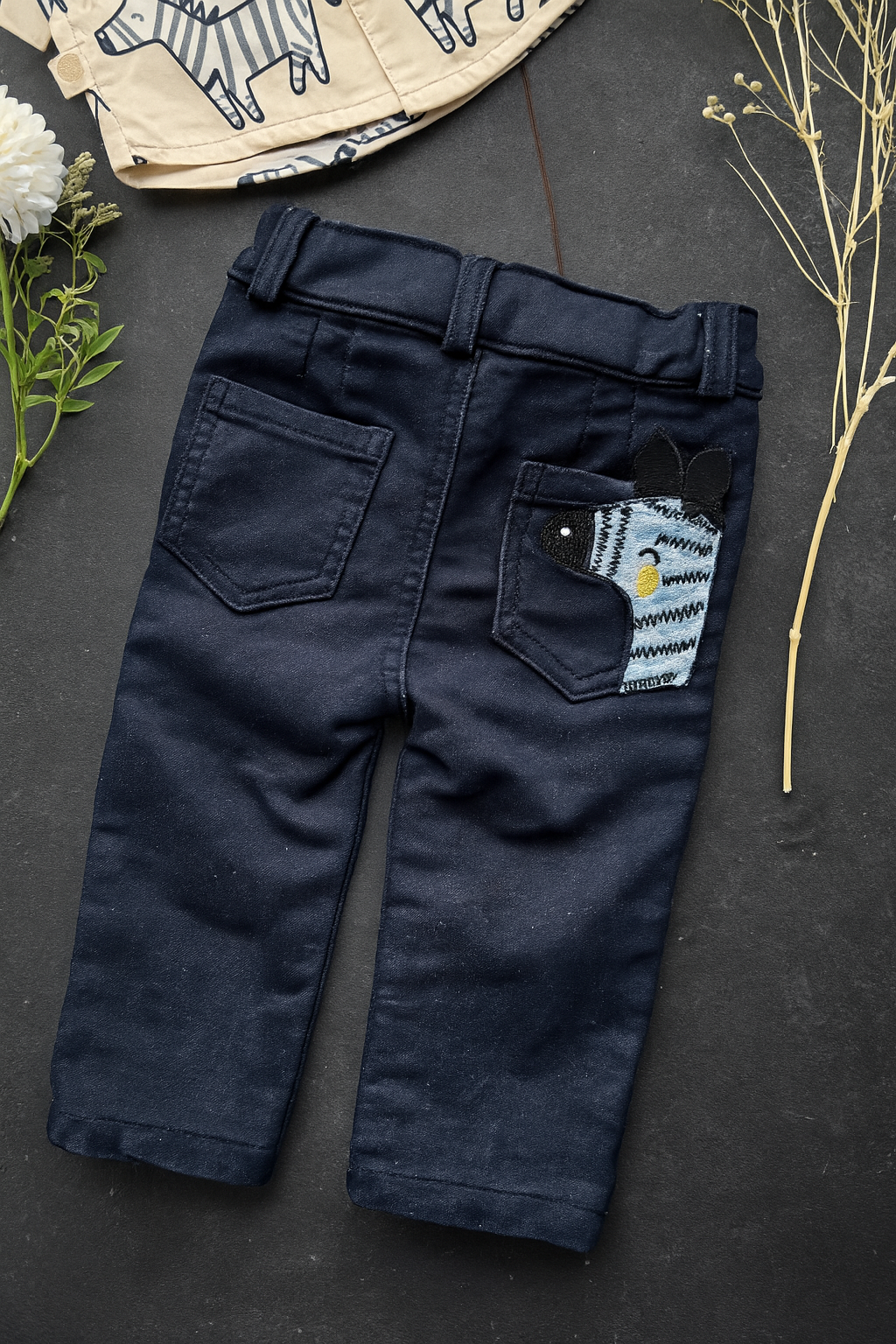 El pantalón en gabardina incluye un delicado bordado de cebra en el bolsillo trasero, cintura con elástico posterior y botones funcionales para mayor comodidad.