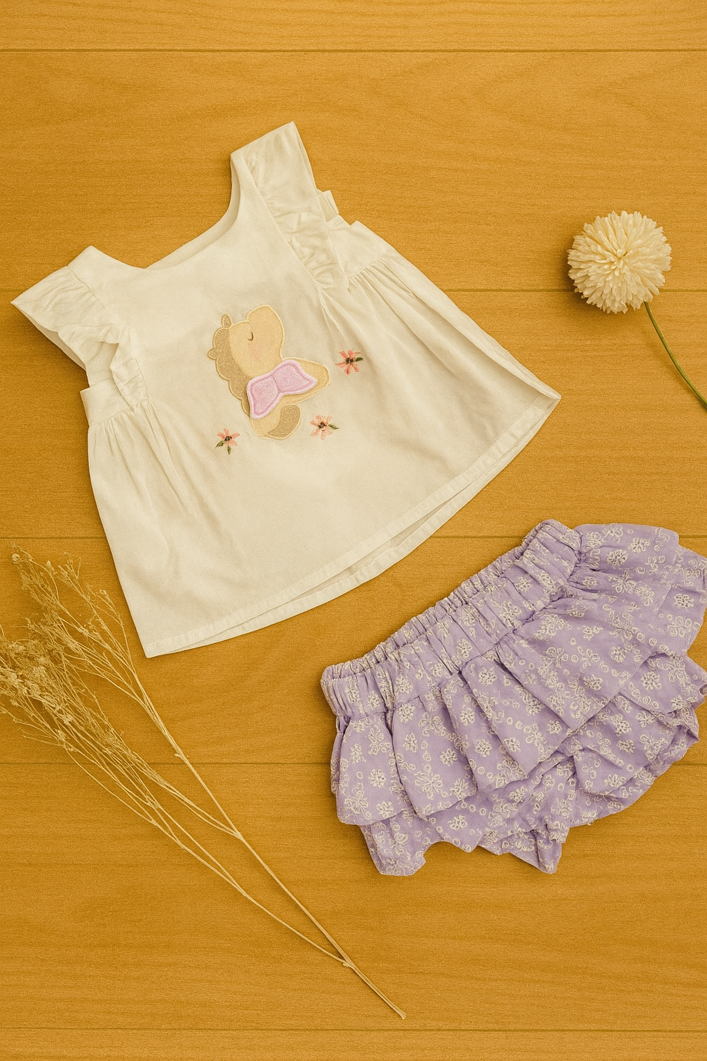 Combina estilo, comodidad y dulzura con este encantador set 2 piezas, short tipo cuquito con volantes y blusita. Su diseño delicado y lleno de detalles lo hace perfecto para cualquier ocasión: desde una salida especial hasta una tarde de juegos.