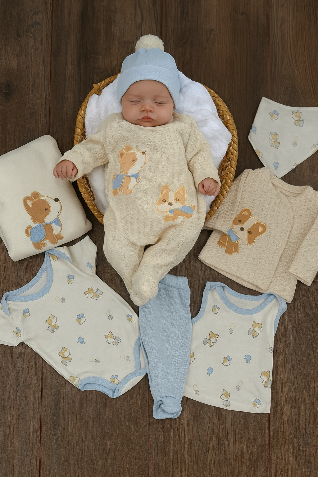 Este encantador Set de Bienvenida x8 piezas incluye todo lo necesario para vestir y abrigar a tu bebé con comodidad y ternura.Está compuesto por:
