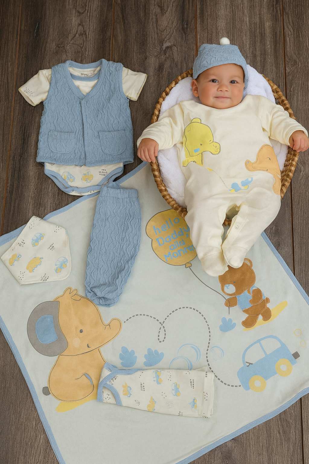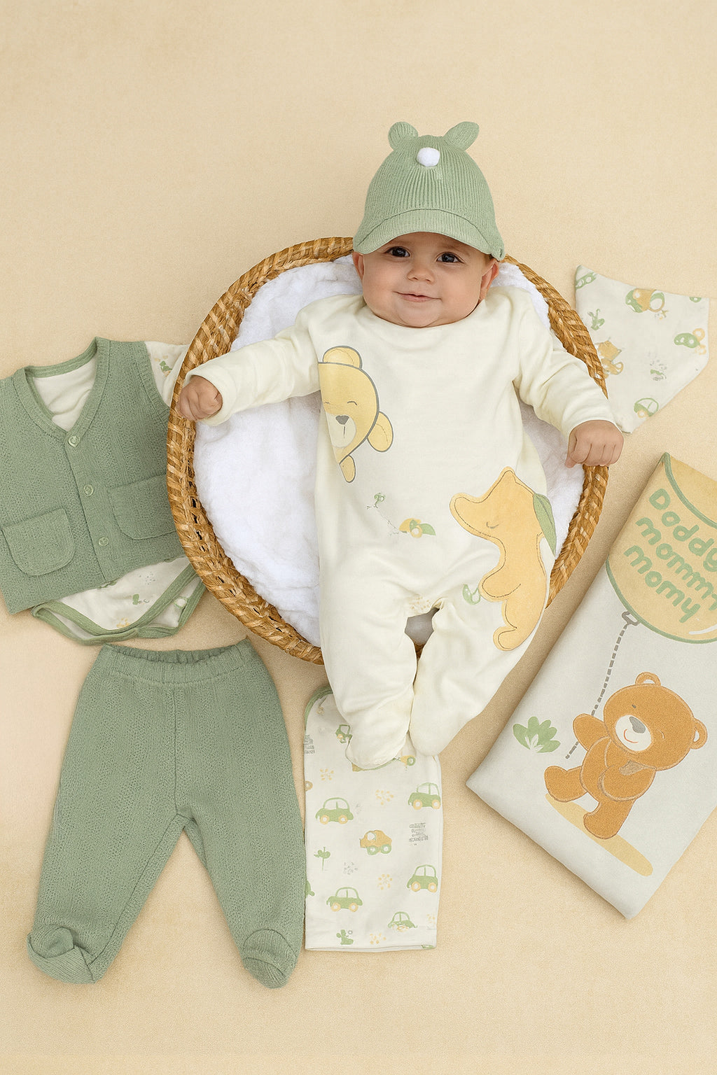 Este encantador set de bienvenida x8 piezas, incluye todo lo necesario para vestir y abrigar a tu peque con comodidad y ternura. Está compuesto por