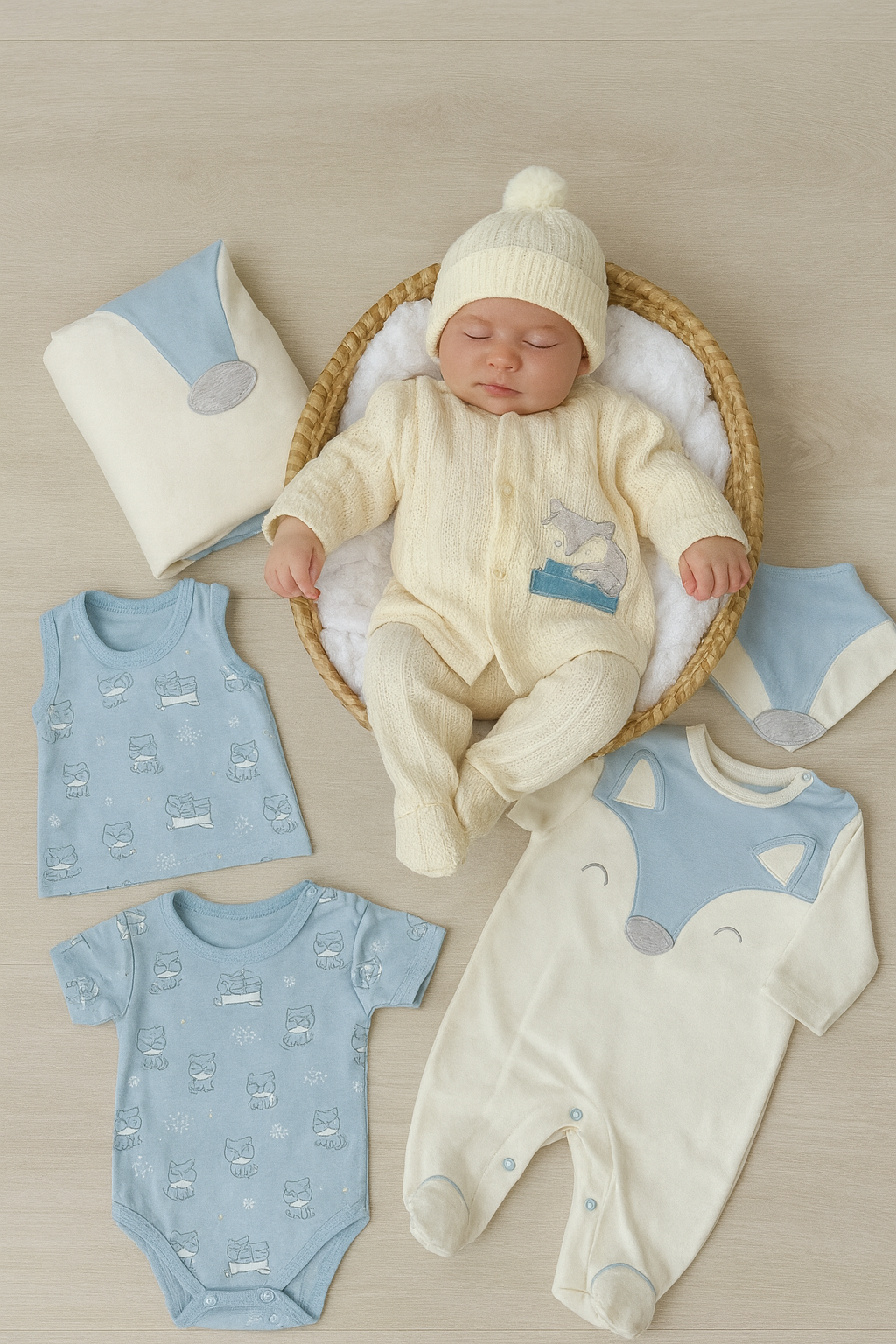 Este encantador set de bienvenida x8 piezas, incluye todo lo necesario para vestir y abrigar a tu peque con comodidad y ternura. Está compuesto por: