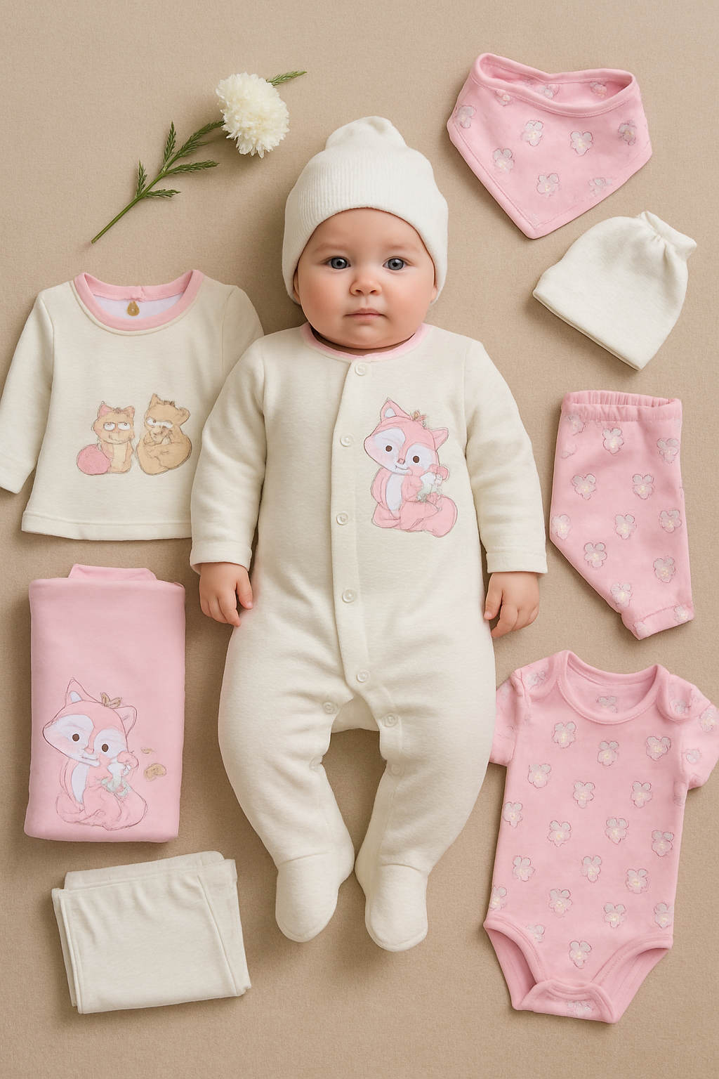 Este encantador Set de Bienvenida x8 piezas incluye todo lo necesario para vestir y abrigar a tu bebé con suavidad y ternura.