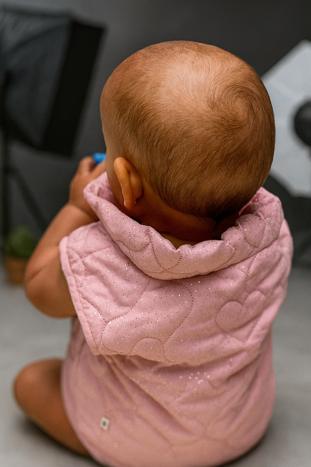 Este chaleco acolchado en tono rosa está diseñado con dibujitos de corazones que lo hacen único y encantador.