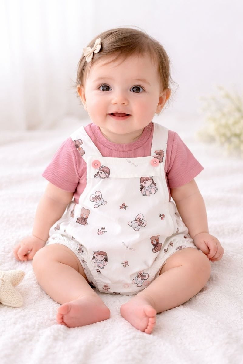 Este encantador conjunto de 2 y tres piezas incluye una blusa en un delicado tono , una braga con tirantes y un gorrito a juego, todo con un tierno estampado.