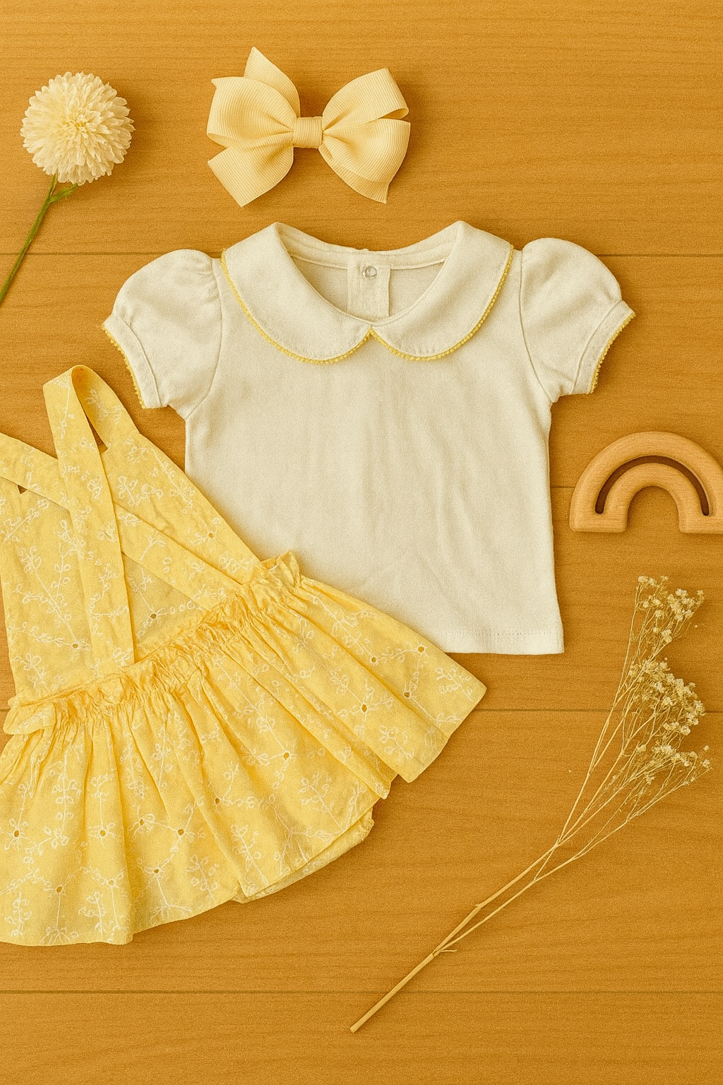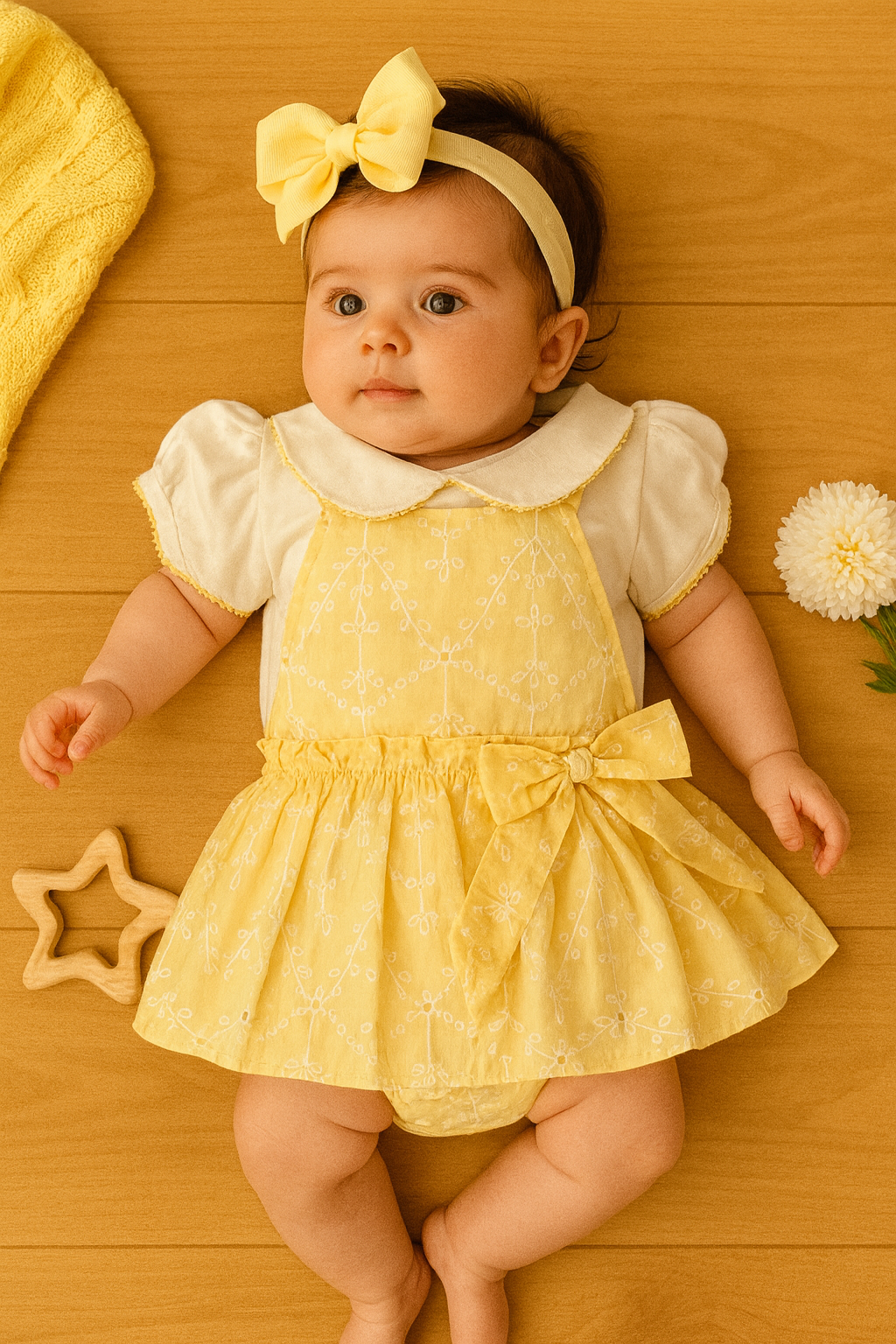 Este conjunto de 3 piezas trae la dulzura del sol en cada detalle. La falda bombacha con tirantes cruzados y bordado floral se combina con una blusa blanca de cuello bebé con ribete amarillo. Incluye un moño a juego para completar el look.